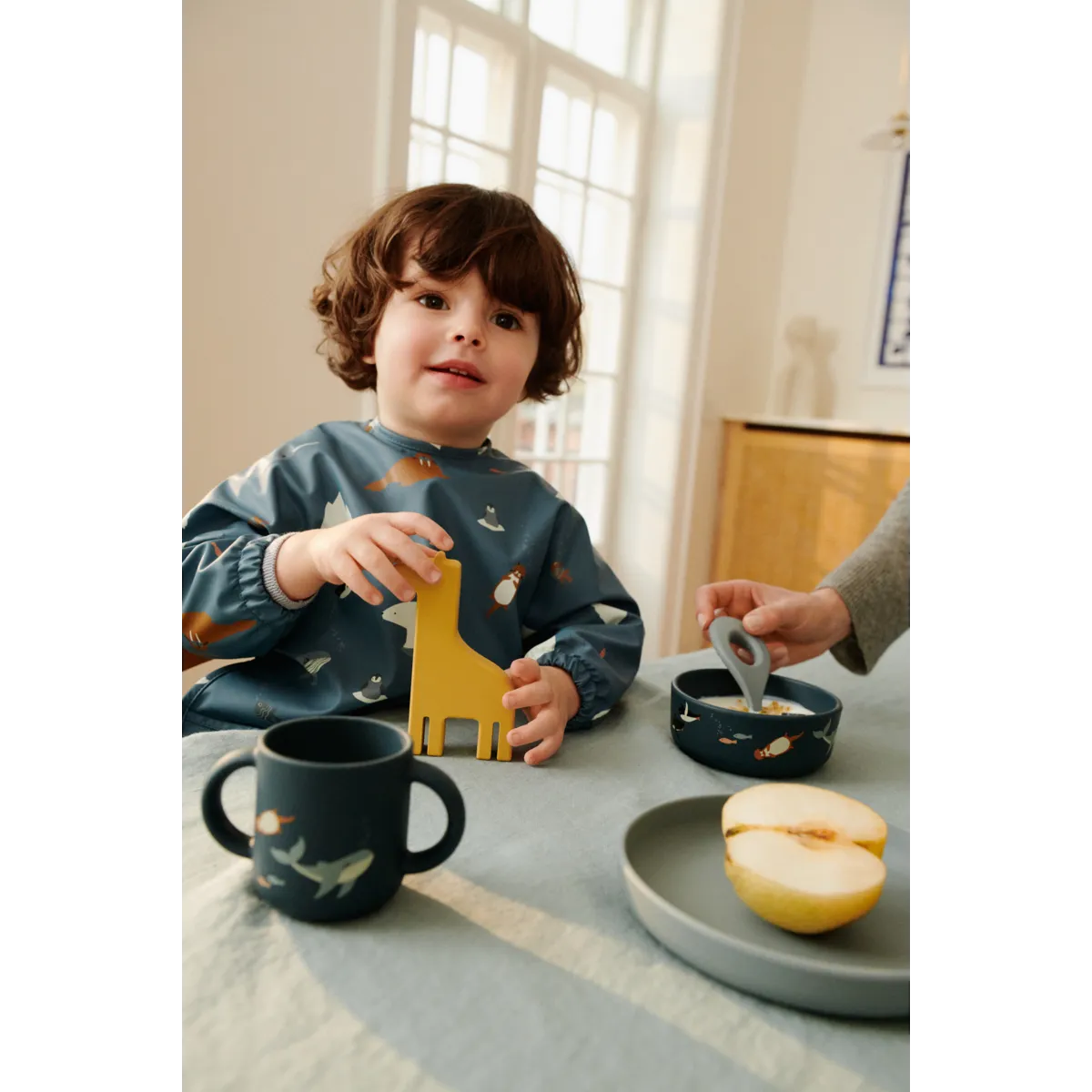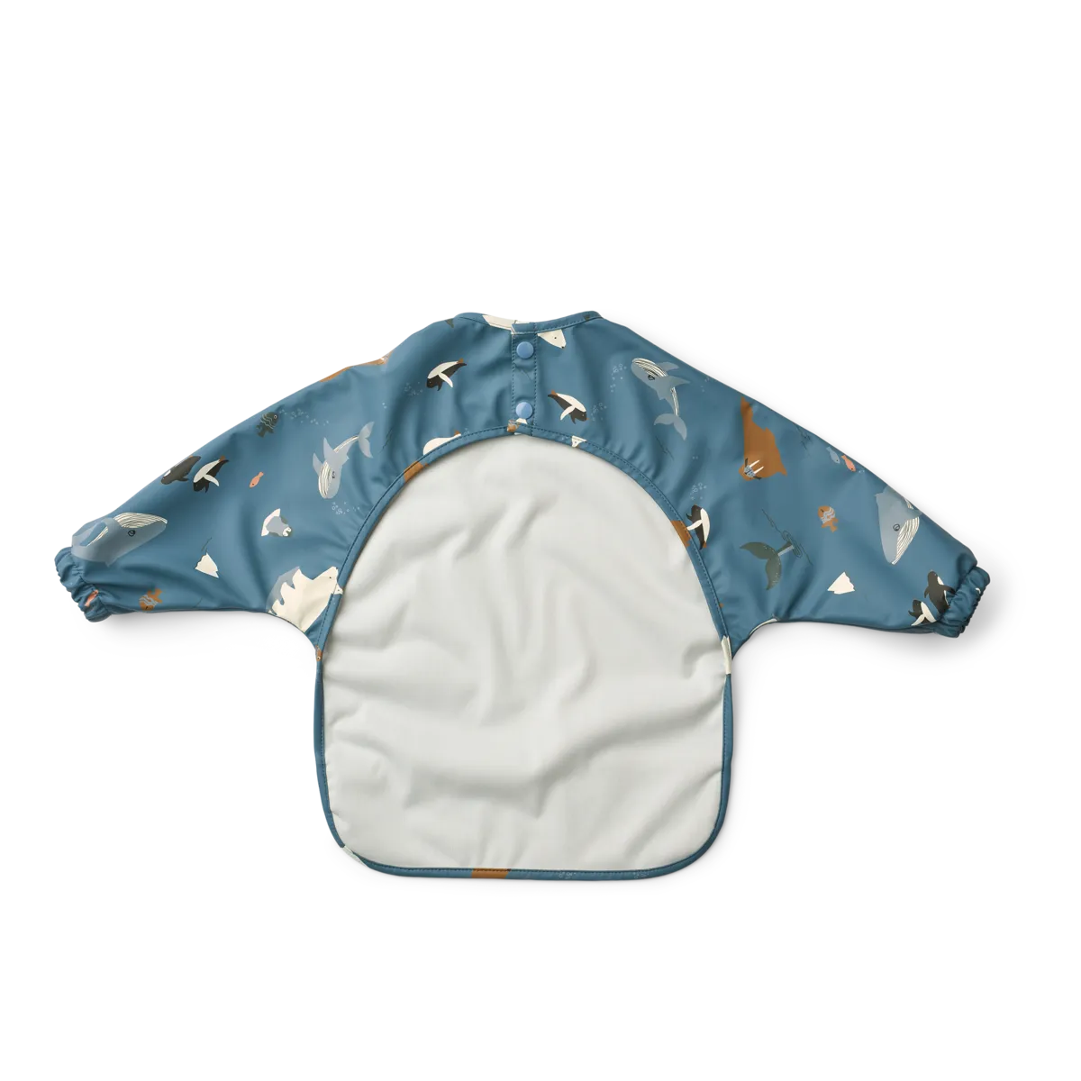 Babero de capa ligera para niños que están aprendiendo a comer. El material reciclado lo hace reutilizable al instante: simplemente enjuague y limpie.