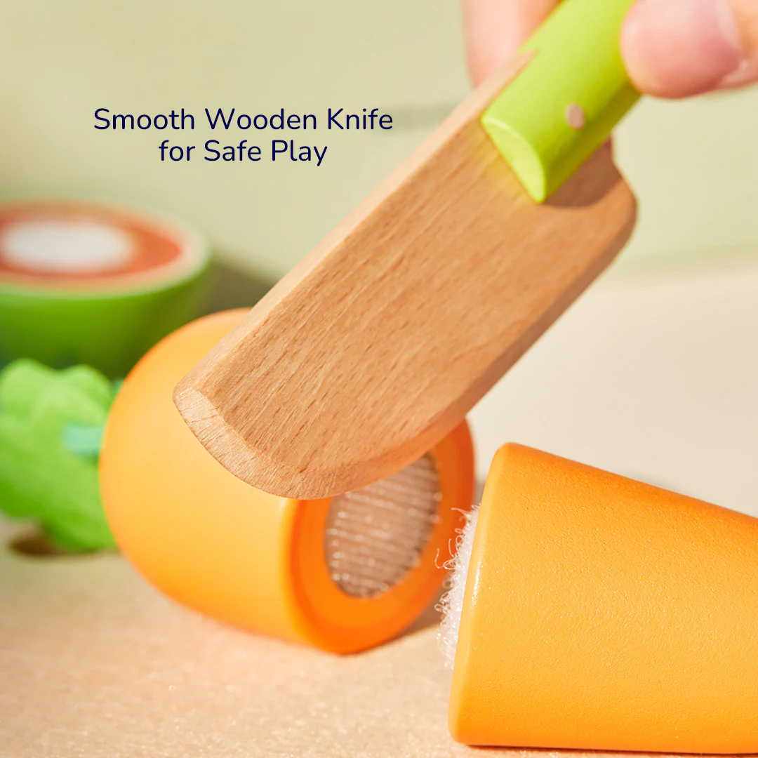 El set de frutas y verduras de madera para cortar es la opción ideal para pequeños chefs que desean asumir el papel de un auténtico cocinero. Con 12 frutas y verduras de madera que incluyen un realista efecto de corte con velcro, los niños desarrollan sus habilidades manuales, la coordinación ojo-mano y la imaginación a través del juego de roles.