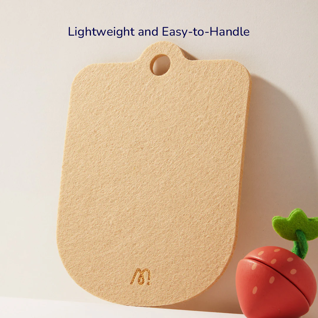 Incluye: 12 frutas y verduras, una tabla de cortar, un cuchillo de madera y un cordón de algodón.