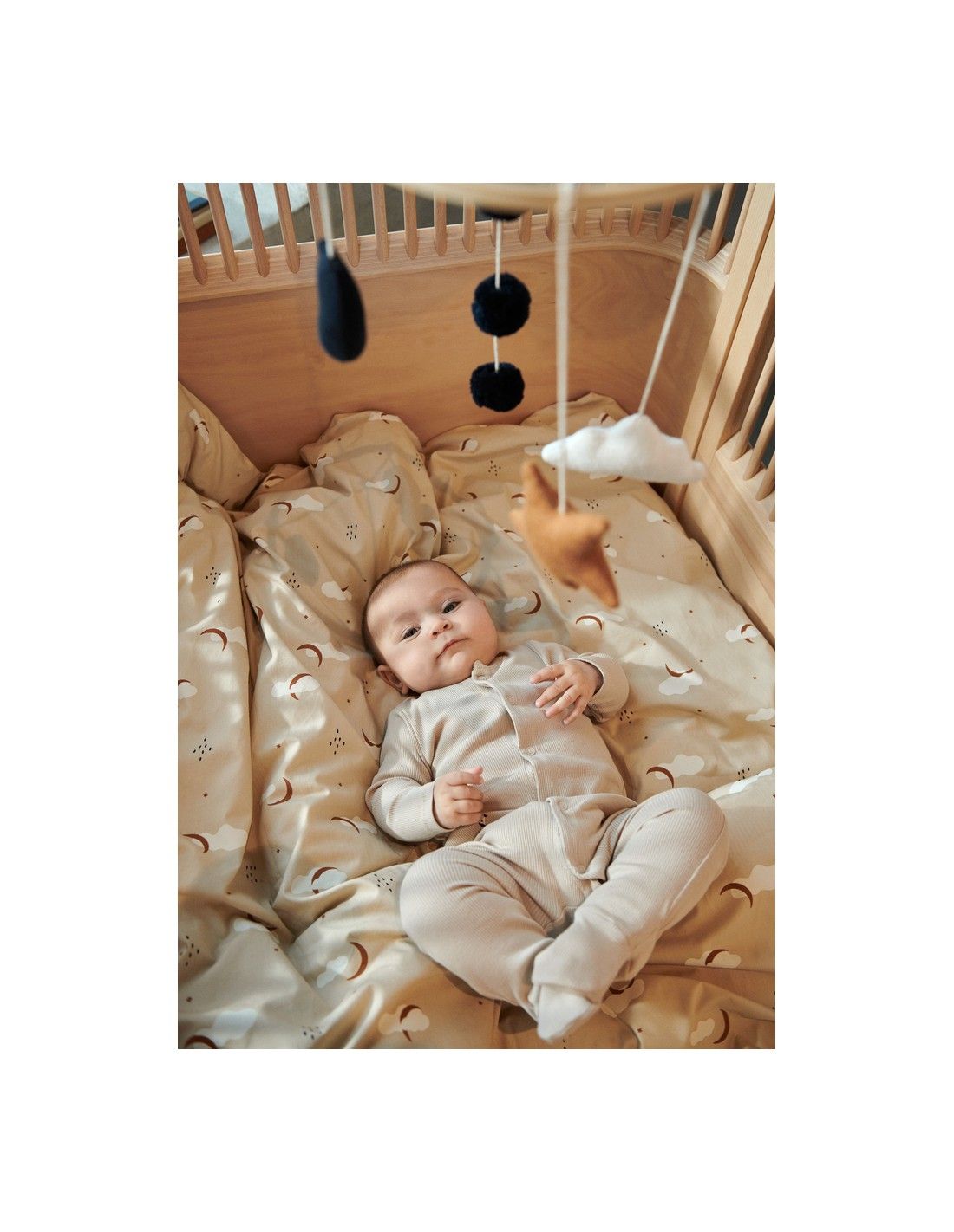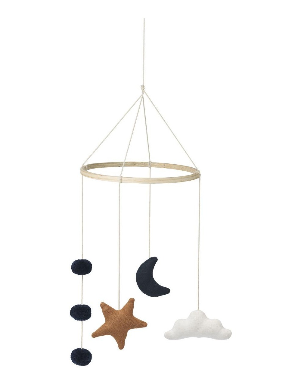 Bonito móvil decorativo con estrellas, lunas, pompones y nubes, ideal colgar sobre la cuna ó el cambiador del bebé y mantenerlo entretenido.