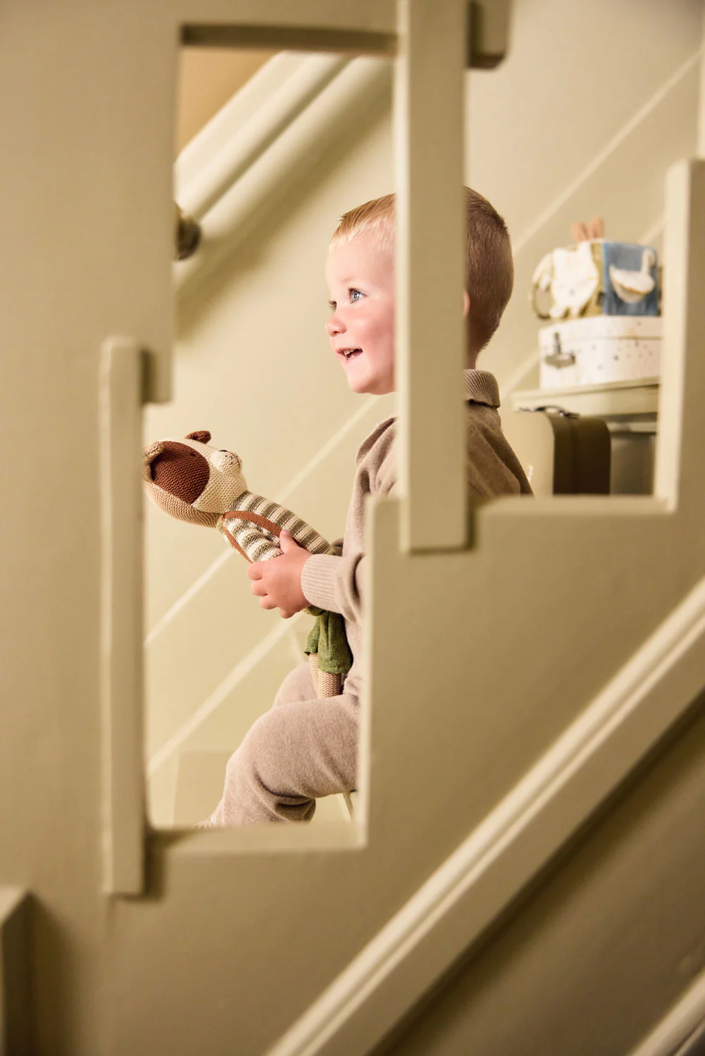 Este encantador peluche de punto está diseñado para llenar de ternura y fantasía los días de tu pequeño. Su cuerpo suave y agradable al tacto invita a abrazarlo sin parar, mientras que su estructura le permite mantenerse erguido, convirtiéndolo también en un adorno perfecto para la habitación infantil.