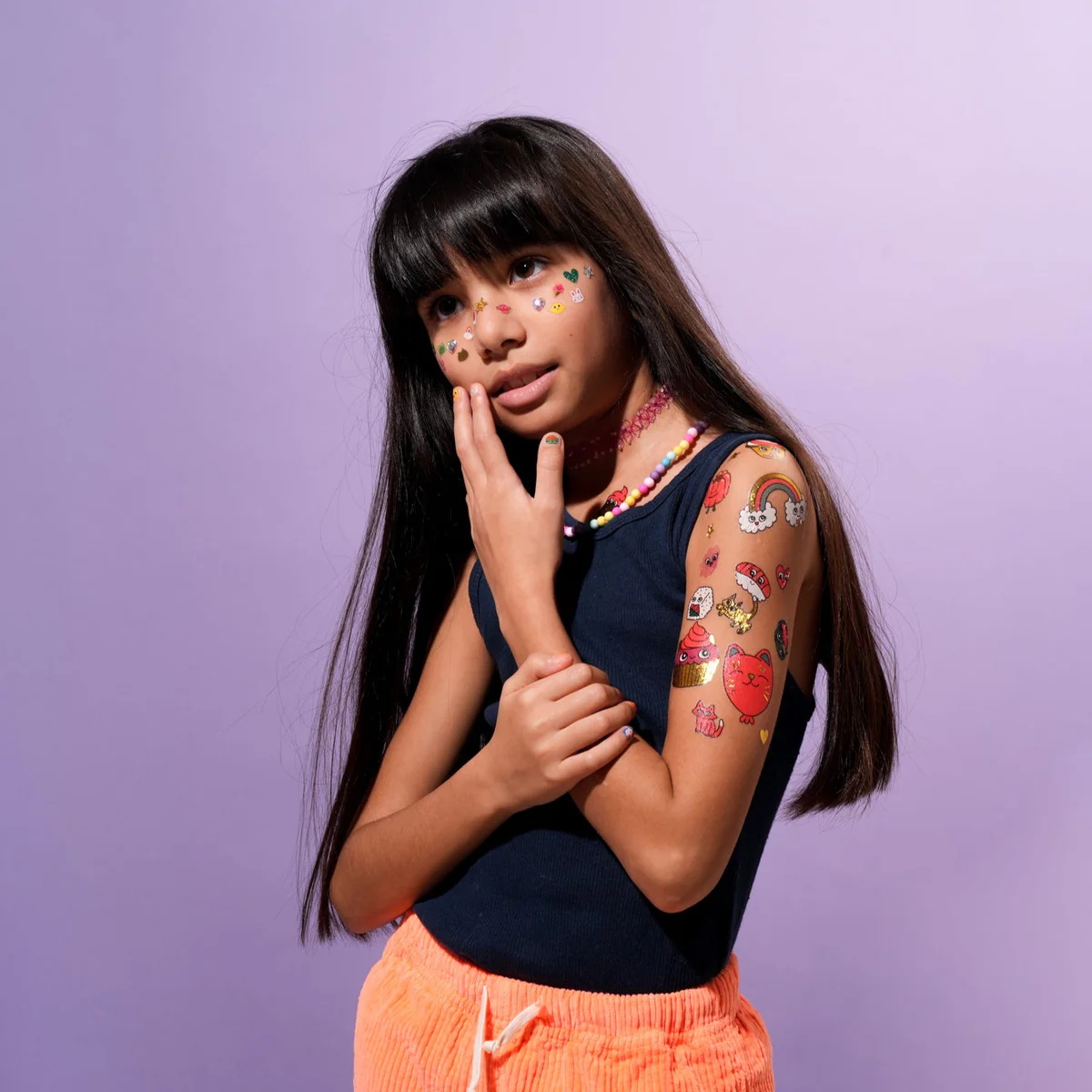 Descubre dentro de esta bolsita, 50 tatuajes temporales fluorescentes, dorados y coloridos para pegar en cualquier lugar durante todo el año.Además de ser fáciles de usar, los tatuajes son duraderos y están dermatológicamente probados.